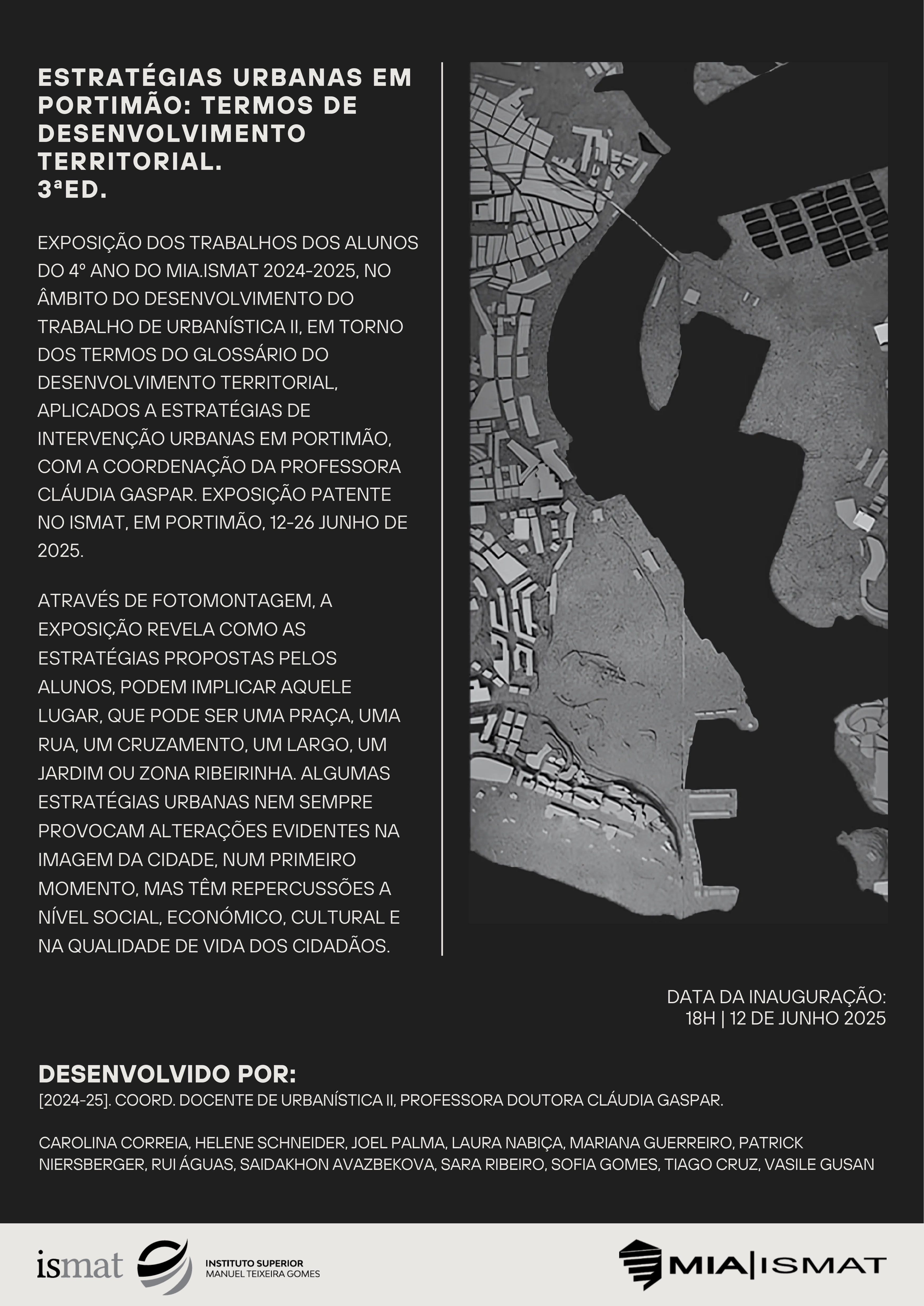 The Multimedia Exhibition “Urban Strategies in Portimão: Terms of Territorial Development” is the result of work carried out by the 4th year students of the Integrated Master's Degree in Architecture at ISMAT, in the 2024/25 academic year, as part of the Urban Planning II course. This educational project focuses on applying concepts from the Territorial Development Glossary, reflecting on urban intervention strategies that promote sustainable and structured development of the territory of the city of Portimão.