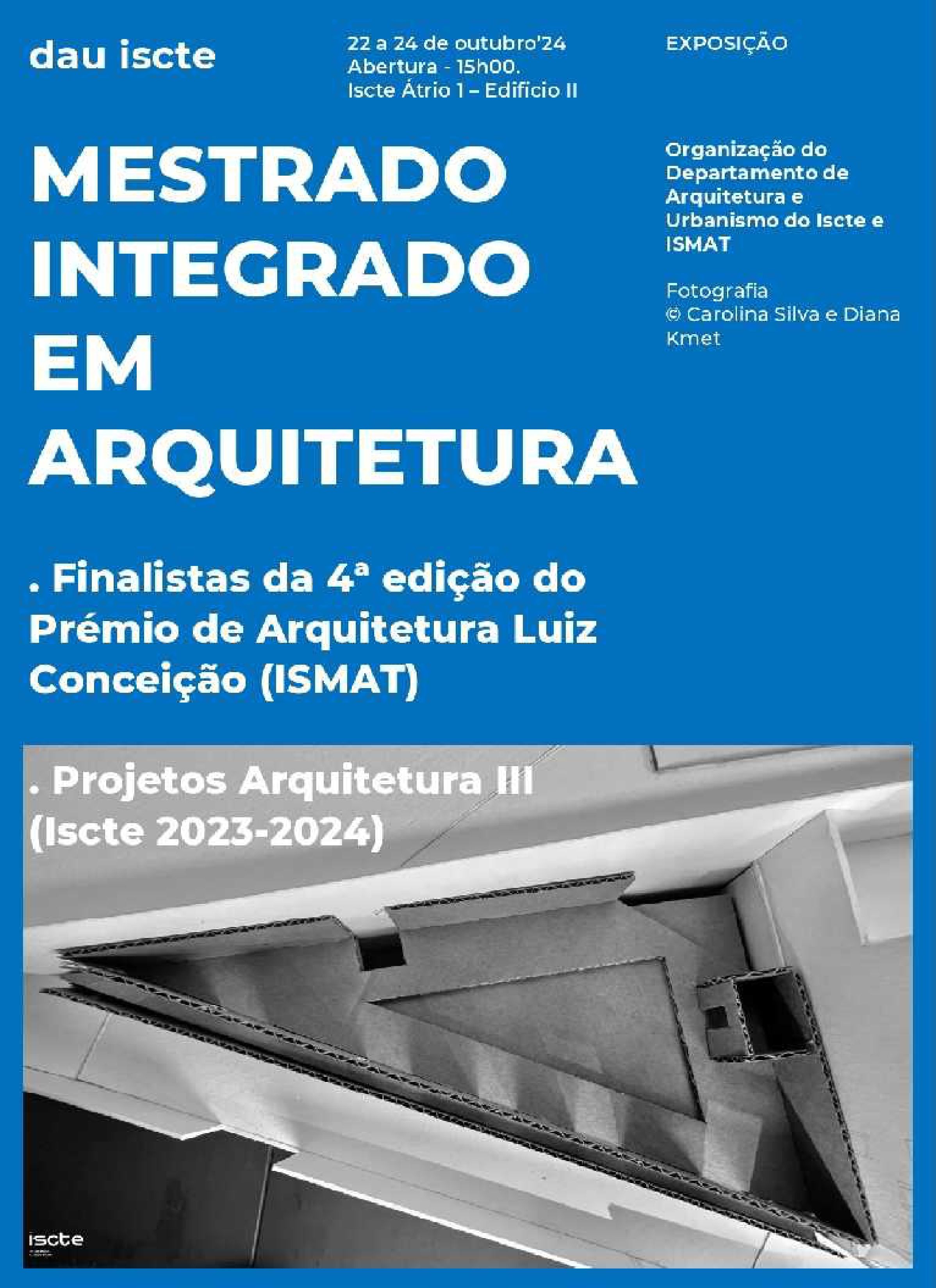 No ISCTE, realiza-se a Exposição conjunta dos trabalhos dos alunos do 2.º ano do Mestrado Integrado em Arquitetura do ISCTE e os 10 trabalhos finalistas da 4.º edição do Prémio Internacional de Arquitetura Luiz Conceição, entre os quais se encontram os trabalhos de Ana Lapa Viana e Andreia Mateus, estudantes do curso de Arquitetura do ISMAT.