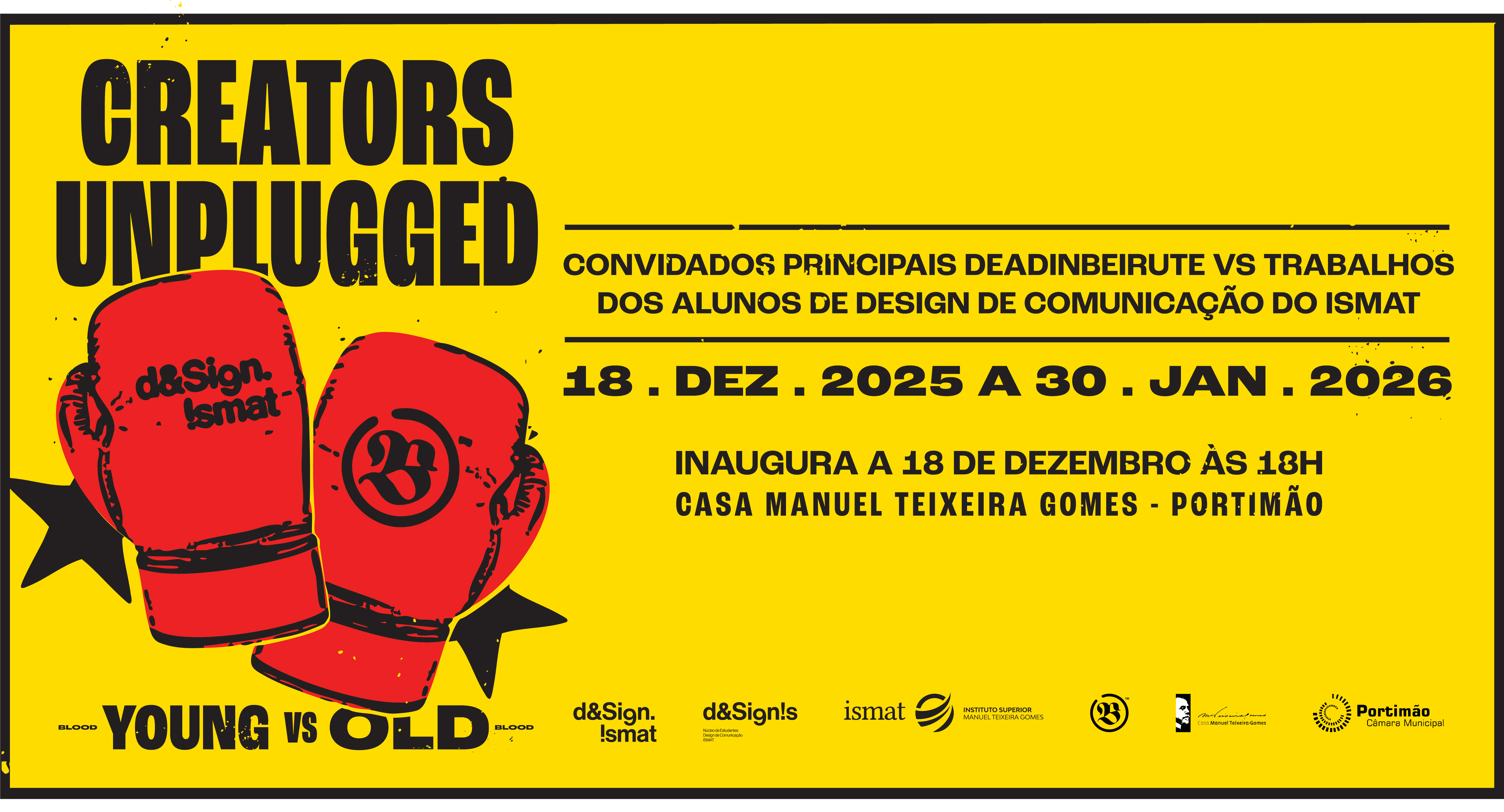 A Casa Manuel Teixeira Gomes, em Portimão, recebe de 18 de dezembro de 2025 a 30 de janeiro de 2026 a exposição “Creators Unplugged – Young vs Old Blood”, que coloca lado a lado trabalhos dos alunos do curso de Design de Comunicação do ISMAT e projetos da agência portuguesa Deadinbeirute.