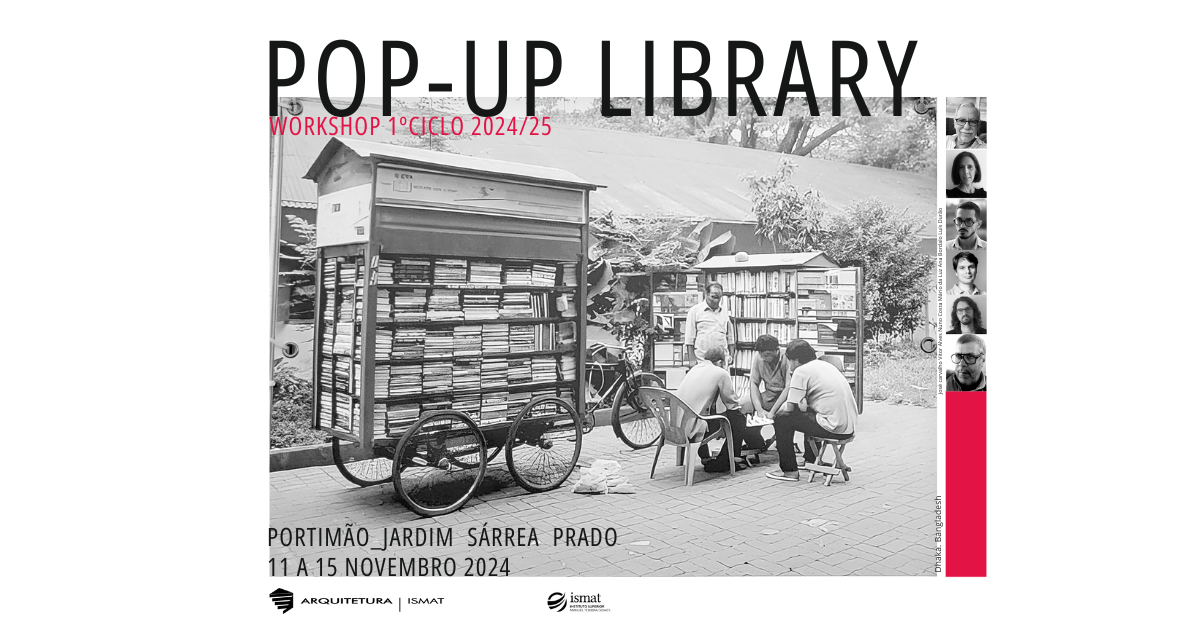 O Workshop POP-UP LIBRARY destina-se aos estudantes do primeiro ciclo de estudos do Mestrado Integrado em Arquitetura do ISMAT, com o objetivo de promover e desenvolver ferramentas de trabalho de grupo e de liderança, partindo do desenvolvimento de um projeto para uma pequena biblioteca, numa simulação do ambiente em atelier.