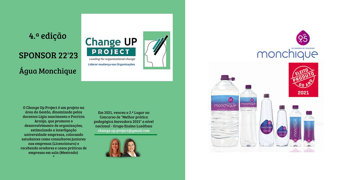 O Change Up Project é um projeto na área da Gestão, dinamizado pela Licenciatura de Gestão de Recursos Humanos do ISMAT, nomeadamente pelas docentes Lígia nascimento e Patrícia Araújo, que promove o desenvolvimento de organizaçães, estimulando a interligação universidade-empresas, colocando estudantes como consultores juniores nas empresas (Licenciatura) e recebendo oradores e casos práticas de empresas em sala (Mestrado).