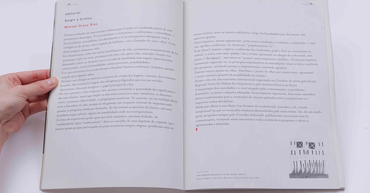 (…) Manuel Graça Dias resumia em poucas palavras as tarefas de uma arquitetura crítica em tempos adversos: “A Arquitetura é crítica sempre que questiona programas, lugares, símbolos, convenções, hábitos, modos de produção, usos, políticas, ensino. Há muitos modos inteligentes e úteis de o fazer; inútil é nada questionar” (JA#239, p.47).