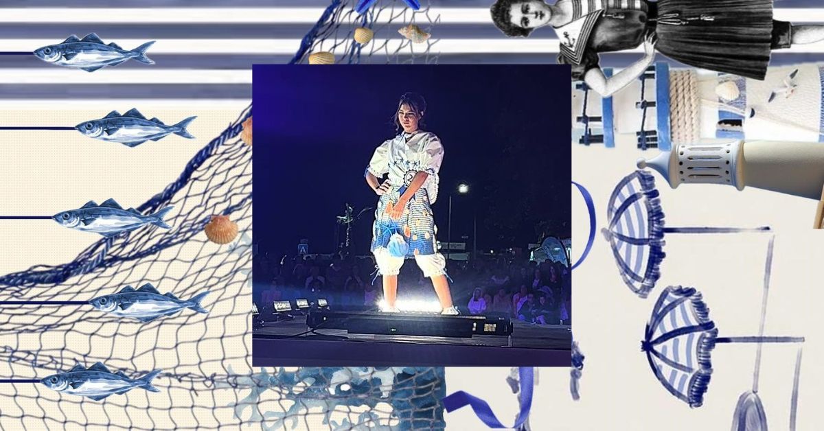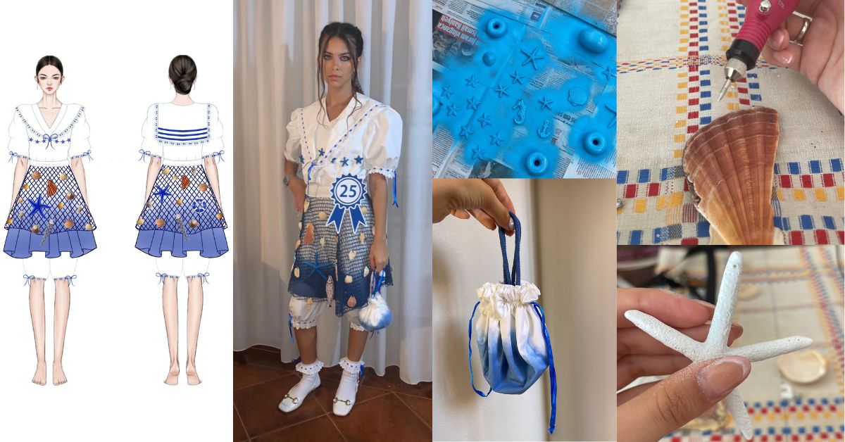 Para o desenvolvimento do traje, a estudante refere que teve como base de inspiração o vestuário de banho típico da época dos anos 20, nas praias da zona geográfica de Lagos, como a praia da Batata e da Meia Praia, e trouxe elementos relacionados com atividade pesqueira e com o ambiente marinho.