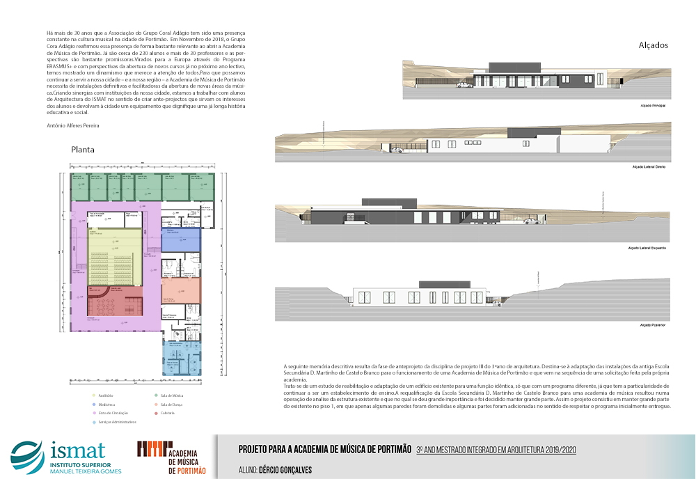 O Diretor da Associação do Grupo Coral Adágio, Professor António Alferes Pereira, refere que “há mais de 30 anos que a esta asspciação tem sido uma presença constante na cultura musical na cidade de Portimão. Em novembro de 2018, o Grupo Cora Adágio reafirmou essa presença de forma bastante relevante ao abrir a Academia de Música de Portimão. Já são cerca de 230 alunos e mais de 30 professores e as perspetivas são bastante promissoras. Virados para a Europa através do Programa ERASMUS+ e com perspetivas da abertura de novos cursos já no próximo ano letivo, temos mostrado um dinamismo que merece a atenção de todos. Para que possamos continuar a servir a nossa cidade – e a nossa região – a Academia de Música de Portimão necessita de instalações definitivas e facilitadoras da abertura de novas áreas da música. Criando sinergias com instituições da nossa cidade, estamos a trabalhar com alunos de Arquitectura do ISMAT no sentido de criar anteprojetos que sirvam os interesses dos alunos e devolvam à cidade um equipamento que dignifique uma já longa história educativa e social.”