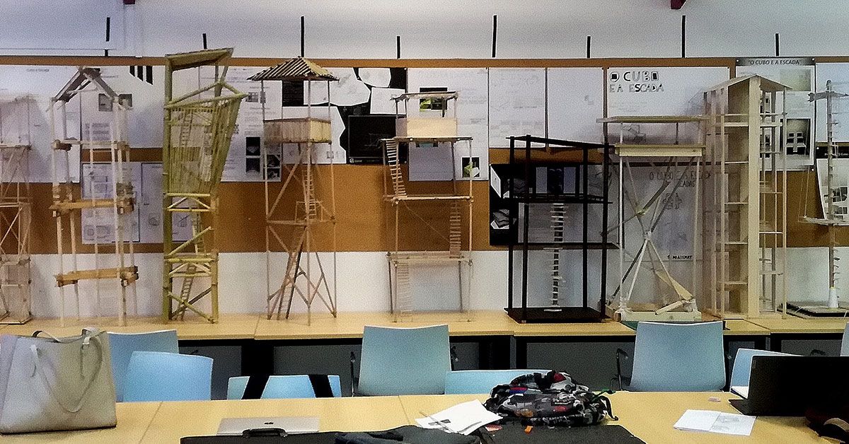 No exercício Miradouro cada aluno do 1.º Ano do Mestrado Integrado em Arquitetura do Instituto Superior Manuel Teixeira Gomes é convidado a criar, construindo, um miradouro em torre, utilizando apenas madeira, corda e tela.