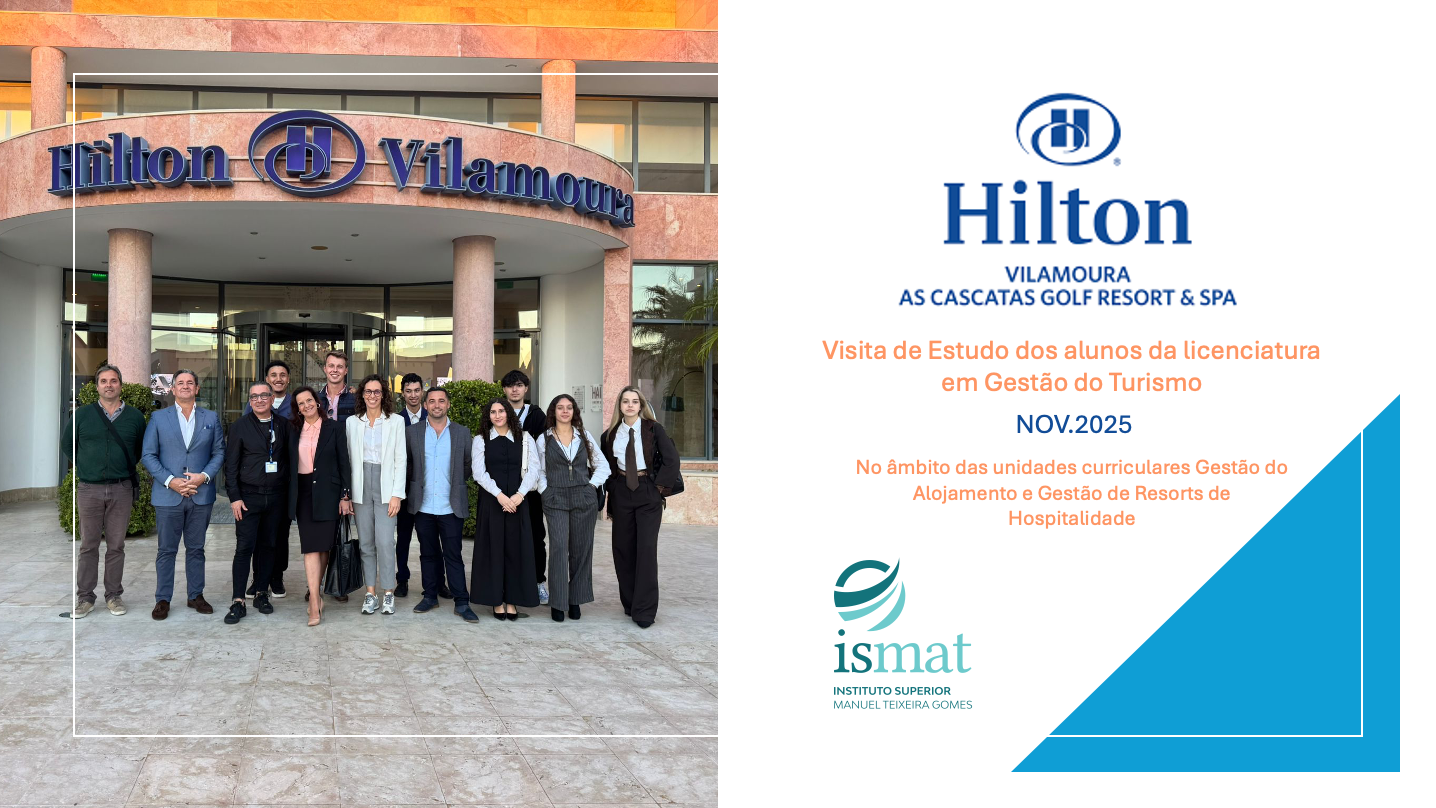 Os estudantes do 2º e do 3º ano da Licenciatura em Gestão do Turismo, no passado dia 20 de novembro, no âmbito da unidade curricular Gestão do Alojamento, lecionada pela Professora Patrícia Correia e da Unidade Curricular Gestão de Resorts em Hospitalidade, lecionada pelo Professor Luís Mota, realizaram uma visita de estudo ao hotel Hilton em Vilamoura.